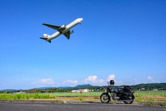 ちょうど飛行機が離陸するタイミングで、CD125Tと並べて撮影することができました。空と陸の乗り物が同じフレームに収まる、ツーリングならではの一枚です。
