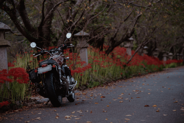神社境内は場所への配慮が最優先。参拝や動線の妨げにならない場所で、背景に花、前景にCB1100の一部を入れて構図を作りました。クロームの反射が強い時は、露出を−0.3段ほど抑えてからシャドウを少し起こすと、金属の質感が落ち着きます。
