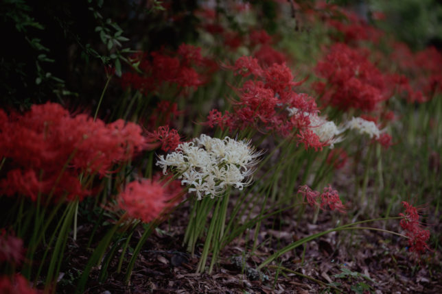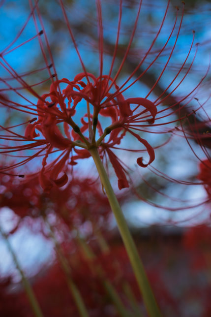 彼岸花の赤は飽和しやすいので、ピクチャープロファイルをナチュラル寄りに。WBは晴天ベースで微調整(アンバー方向に1〜2段)すると、朝の空気感を保ちつつ赤が転ばない印象にまとまります。