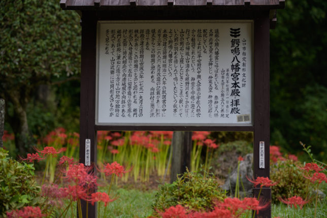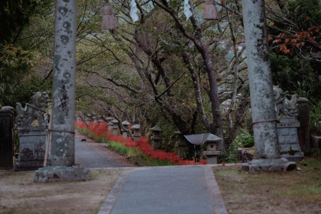 山口市の田園地帯にたたずむ小さな社。周辺は田園が広がり、参道や境内のあちこちに彼岸花が点在します。観光地として混雑するタイプではないので、落ち着いて季節の風景を味わえるのが魅力。早朝は特に人が少なく、撮影にも集中できます。