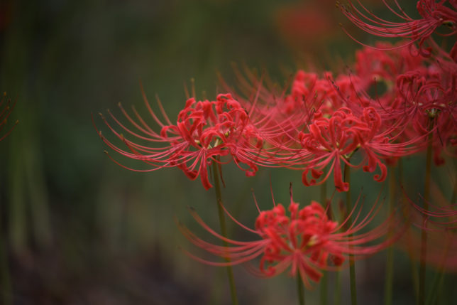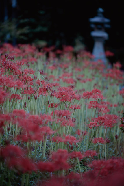 ただし、咲き始めの彼岸花は薄暗い景色+やわらかい光と相性が良く、花弁の透明感や瑞々しさが引き立ちます。密度よりも一本一本の表情を狙うなら、むしろこのタイミングが最適。参道脇・社殿脇・緑の苔むした石など、赤×緑のコントラストが映えるポイントを中心に周回しました。